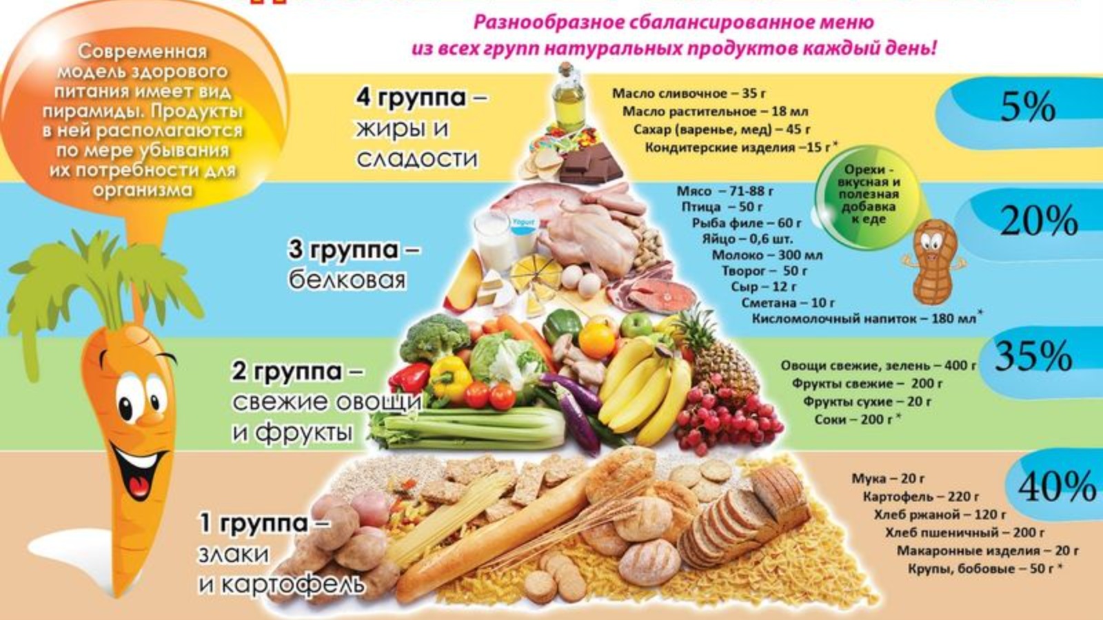 Пирамида питания или пищевая пирамида - схематическое изображение принципов здорового питания, разработанных специалистами. Продукты у основания пирамиды должны употребляться в пищу как можно чаще, в то время, как находящиеся на вершине продукты следует избегать или употреблять в ограниченных количествах.