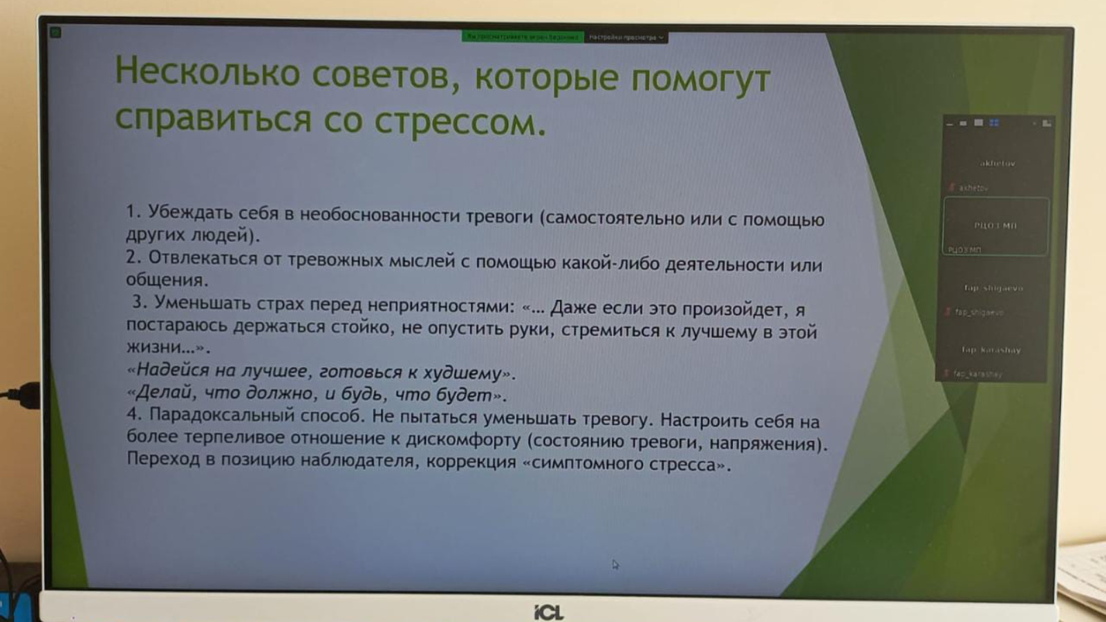 Вероника Николаевна подробно описала проявления стресса в физическом, эмоциональном плане, какие поведенческие проявления могут быт у человека в ответ на такую ситуацию. Пациентам объяснила о негативных последствиях хронического стресса для организма, подробно рассказала, как такая ситуация влияет на сердечно – сосудистую систему (повышается артериальное давление, учащается число сердечных сокращений, повышается уровень холестерина в крови и т.д..).