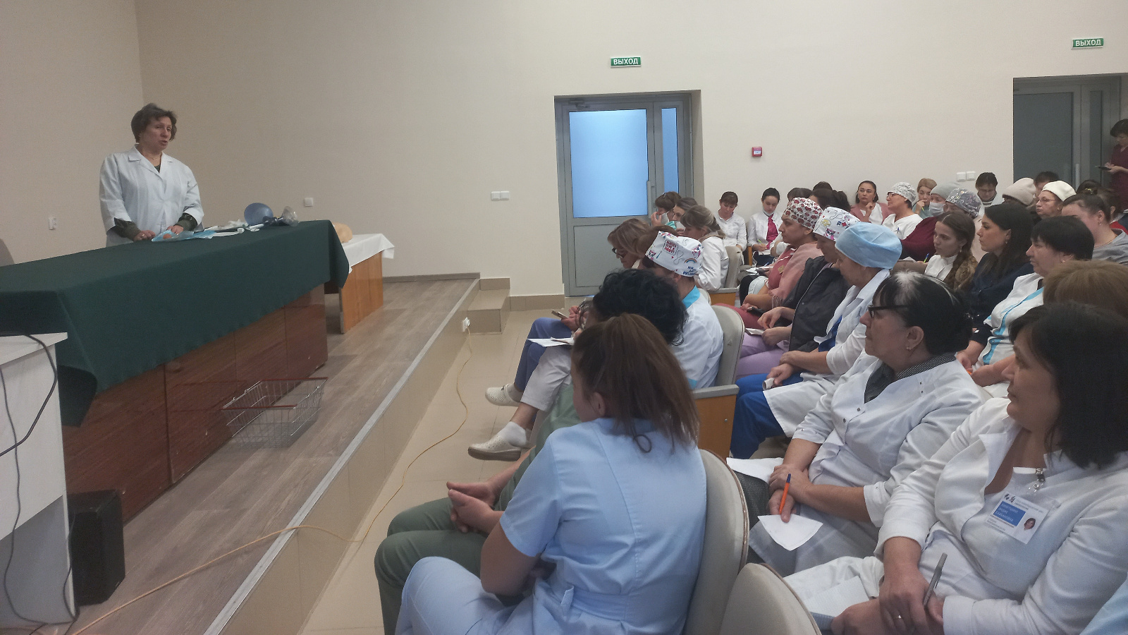 После лекции, главная медицинская сестра больницы Галина Штукина, совместно с старшей медицинской сестрой отделения анестезиологии - реанимации и интенсивной терапии Ольгой Ушатиковой, провели тестирование персонала для закрепления полученных знаний.