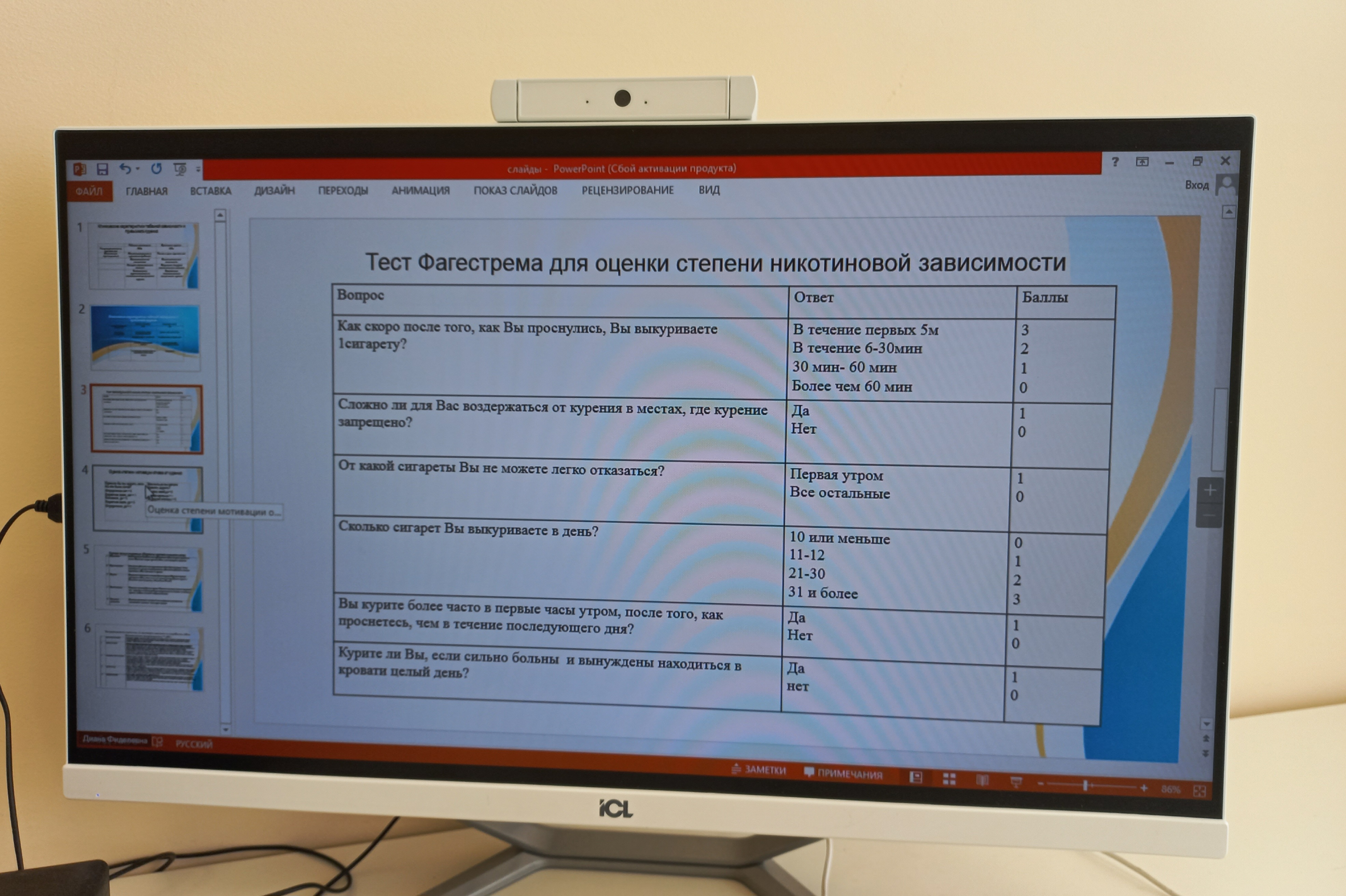 В своем выступлении, Диана Фиделевна рассказала о проявлениях психологической и физической зависимости от табачных изделий, о синдроме отмены, объяснила принципы никотинзаместительной терапии.