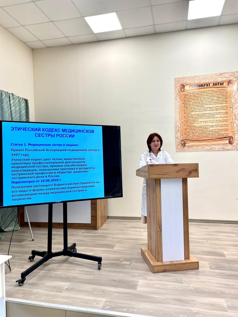 Главная медицинская сестра Галина Штукина провела занятие с демонстрацией слайдов, на темы: «Общение в профессиональной деятельности среднего медицинского персонала» и «Этический кодекс медицинской сестры». В своем выступлении Галина Николаевна подчеркнула, что Этический кодекс дает правильные нравственные ориентиры в профессиональной деятельности медицинской сестры, призван способствовать укреплению и повышению престижа и авторитета сестринской профессии в обществе, развитию сестринского дела.