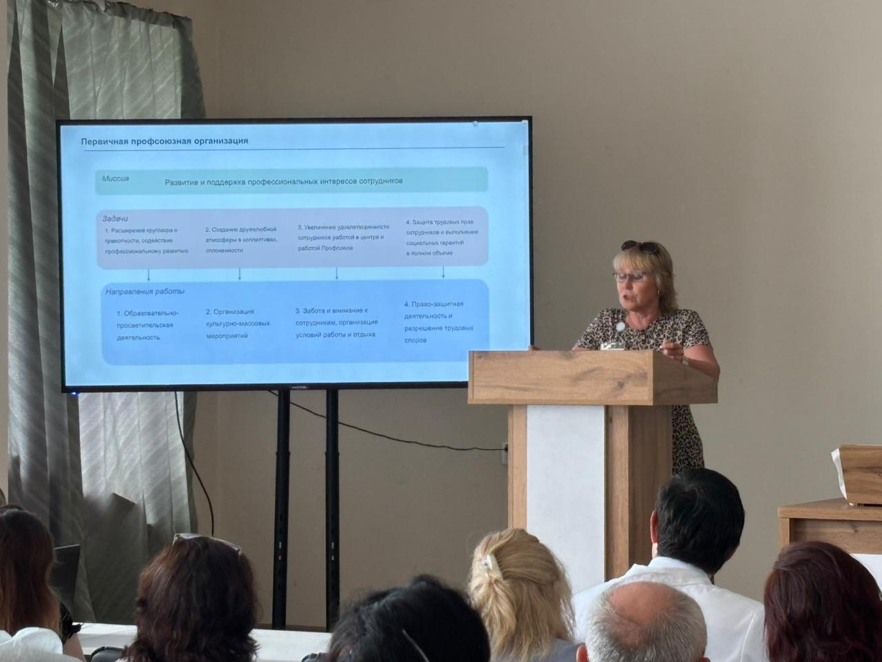 Председатель первичной профсоюзной организации ГАУЗ «МКДЦ» Люция Сулеймановна Фатхуллина поделилась успешным опытом по привлечению сотрудников в профсоюз, сопроводив выступление наглядной презентацией с методиками мотивации, достижениями и планами развития.