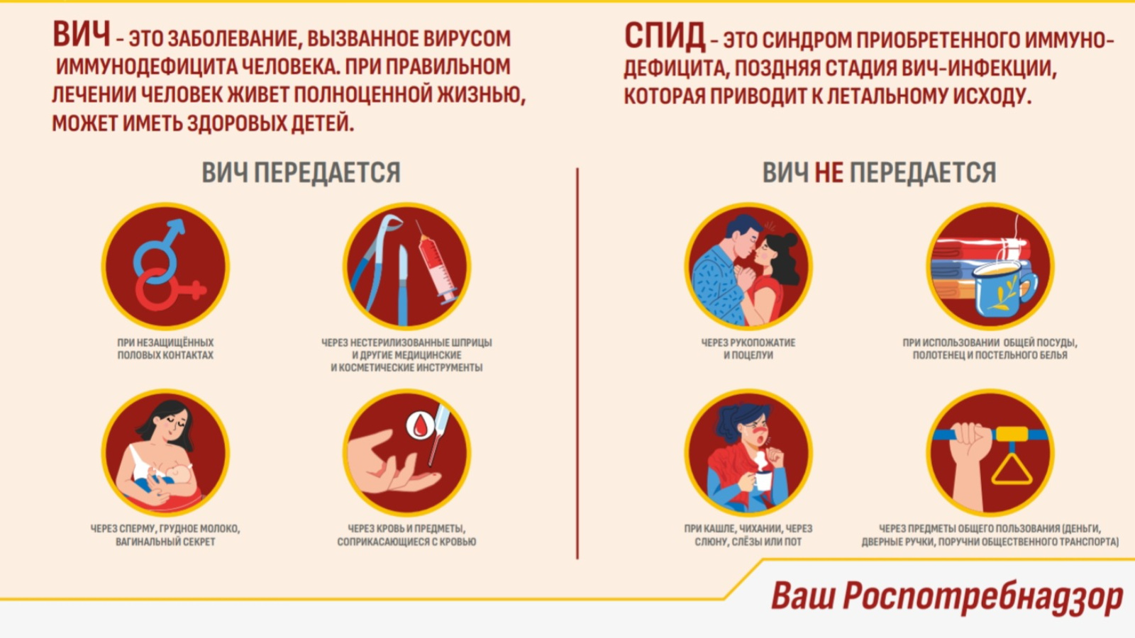 Передача ВИЧ воздушно-капельным, пищевым, водным, трансмиссивным путями не происходит.