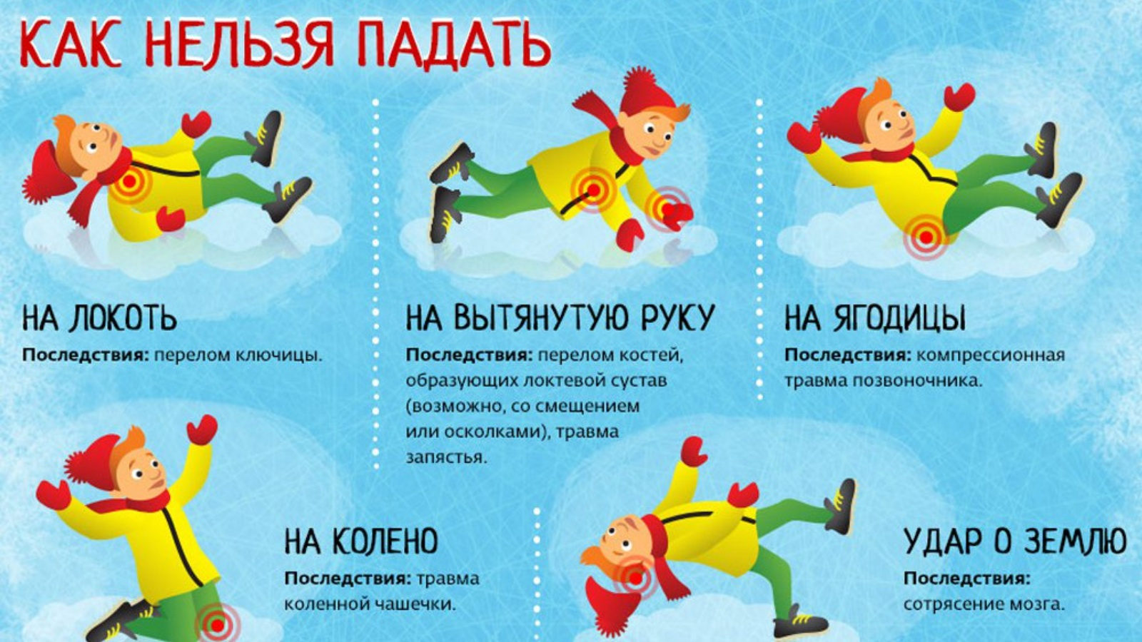 3. Падения: при падении постарайтесь сгруппироваться и приземлиться на бок. Важно: не выставляйте руки вперед - это частая причина переломов верхних конечностей.