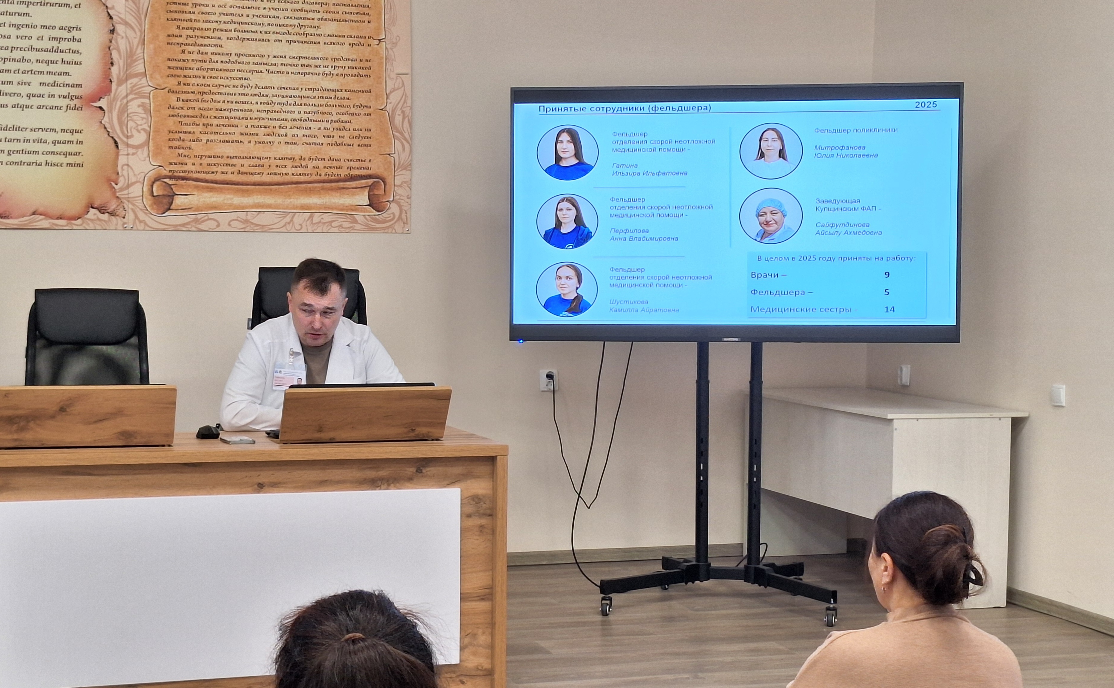 5. Социальная поддержка персонала. Главный врач проинформировал коллектив о действующих государственных программах, включая программу по обеспечению жильём специалистов от администрации Мамадышского района, а также федеральную программу «Земский доктор» для тех, кто переезжает для работы в сельскую местность и малые города.