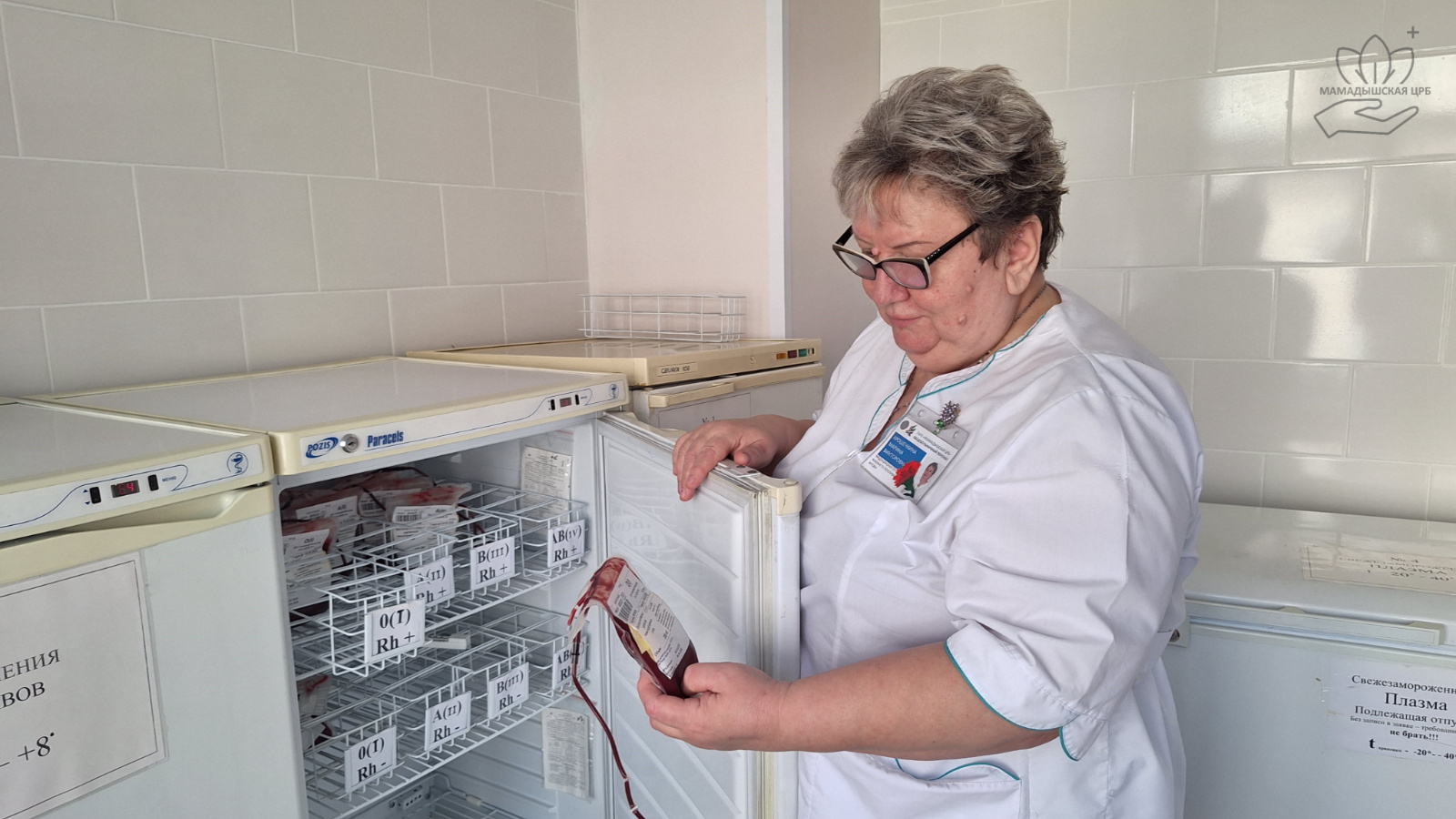 В кабинете переливания крови Мамадышской ЦРБ работает опытная медицинская сестра Марина Викторовна Крошечкина. Благодаря её профессионализму ведутся чёткий учёт, хранение и выдача препаратов крови и плазмы. Именно Марина Викторовна отвечает за определение группы крови и резус-фактора у будущих мам и пациентов перед операциями, а также активно участвует в донорских акциях. ✅🧪